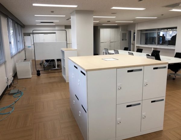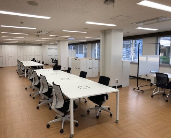 事務課改修に伴い、オフィスレイアウトを大幅に変更しました。 フリーアドレスをテーマとし、無線LANと内線PHSを導入、 ソーシャルディスタンスを保ちながらどのポジションからでも、 スピーディーかつフレキシブルに学生への対応可能なオフィスに仕上がりました。